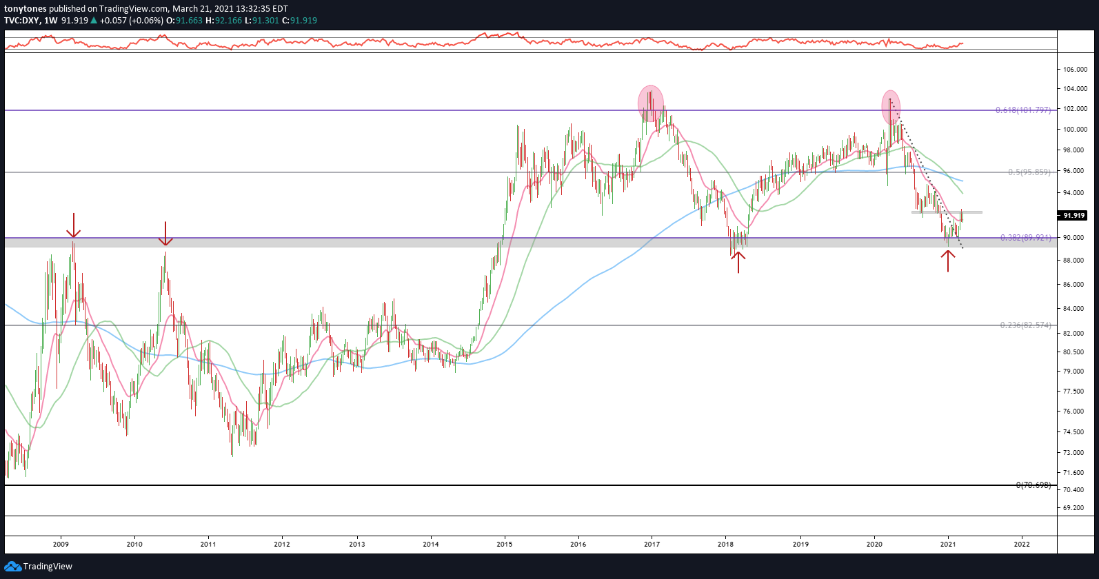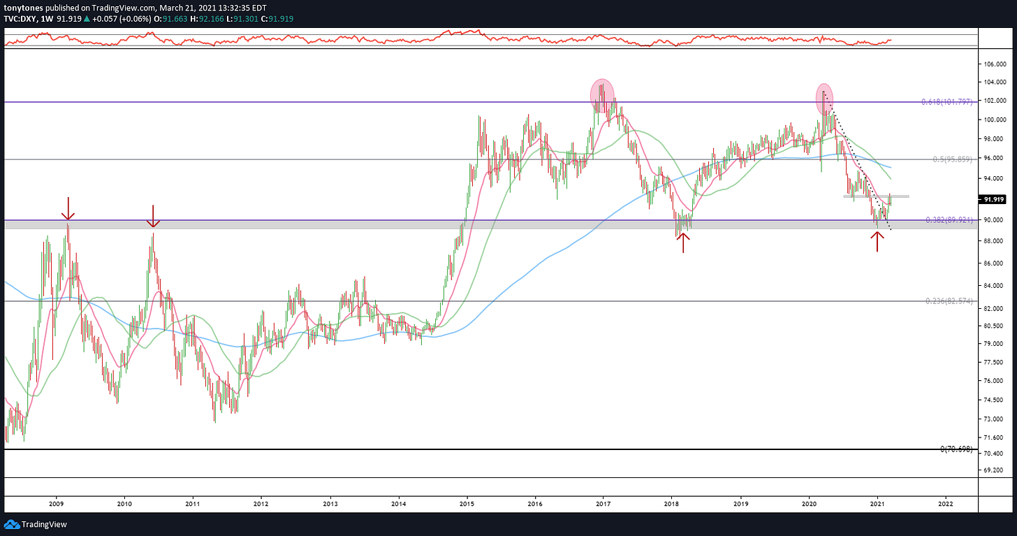 The U.S. Dollar Index ($DXY) has been among the most discussed charts since I began writing because of its relationship with the other themes — commodities, emerging markets, etc.