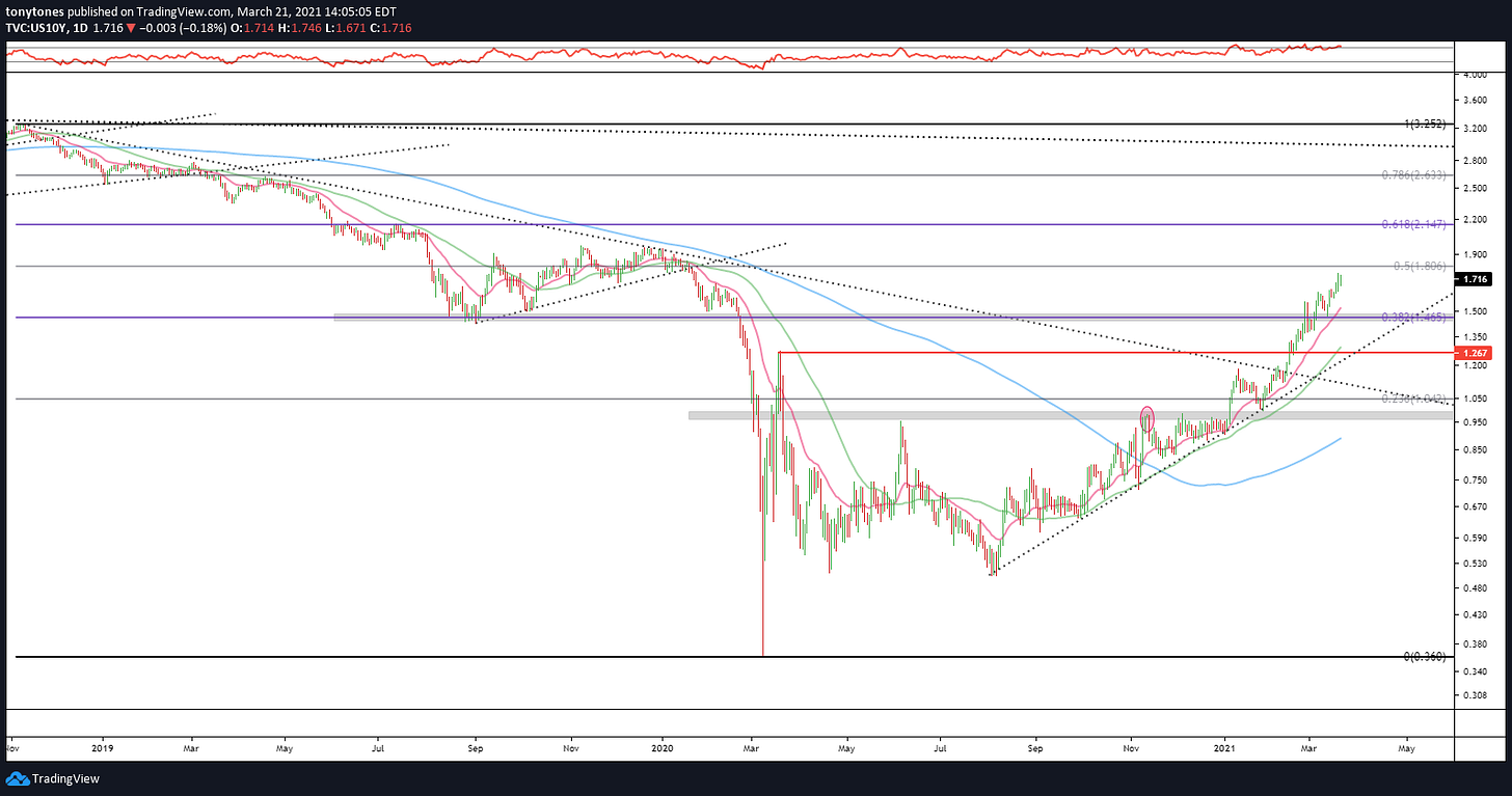 While we have been calling for higher rates since the 10-Year Treasury Rate broke out above 0.95%, the larger downtrend from the early 80’s still persists. That doesn’t mean there isn’t plenty of potential upside remaining.