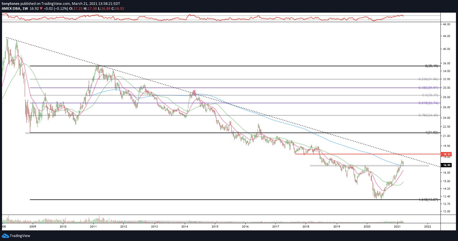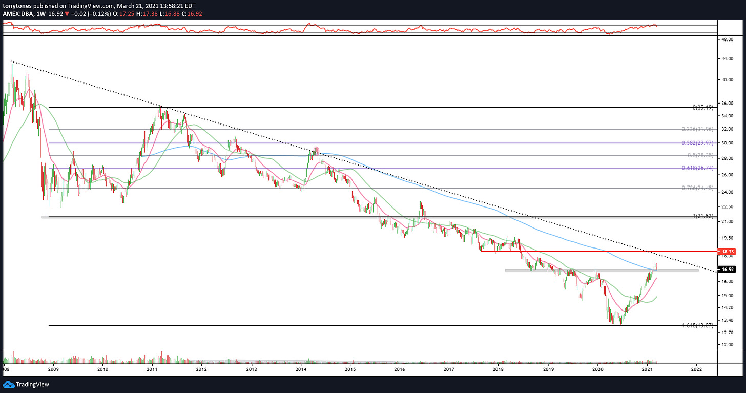 Agricultural commodities ($DBA) are also worth noting. As the chart below shows, we are still within the context of a larger downtrend from the GFC. The ags are trying to hold up above the pre-COVID highs around $17. Above there is another positive.