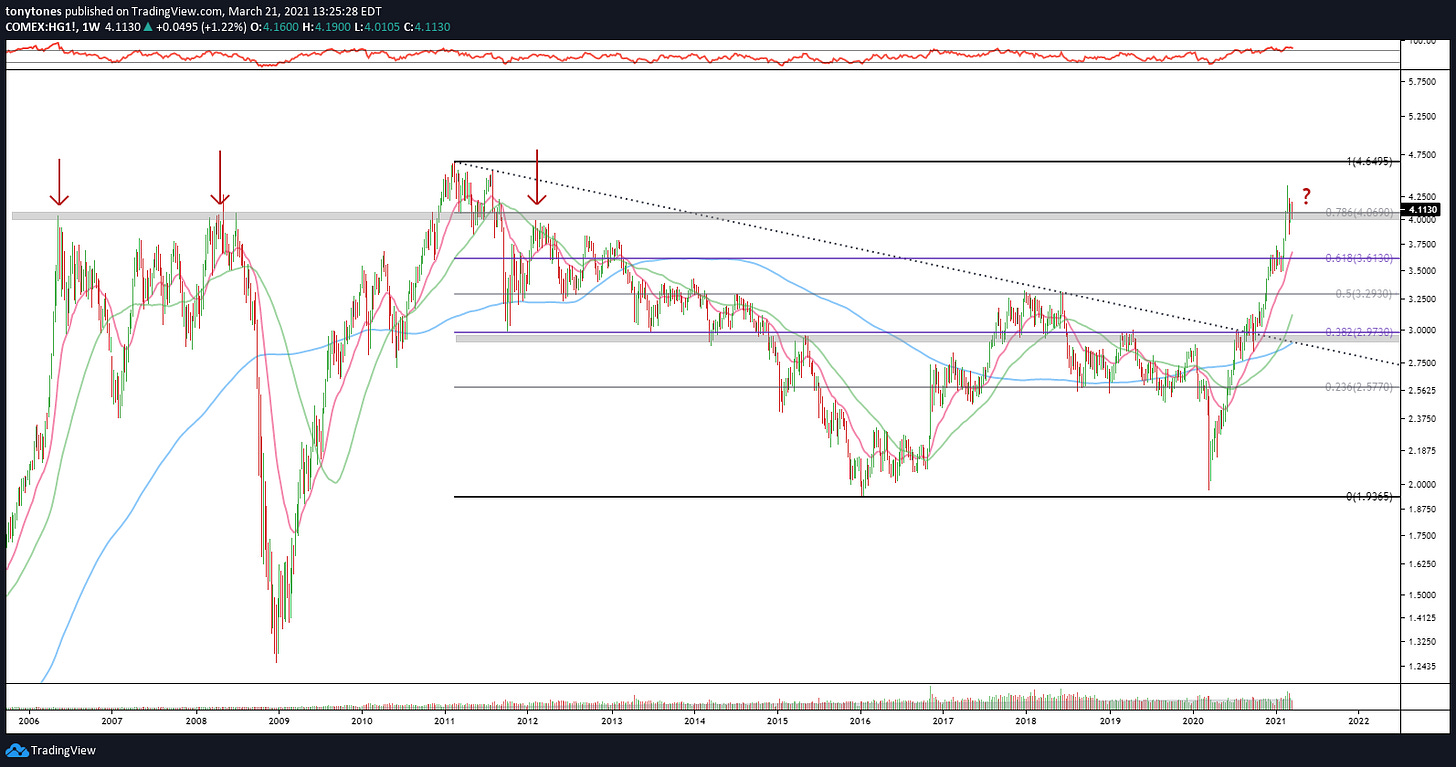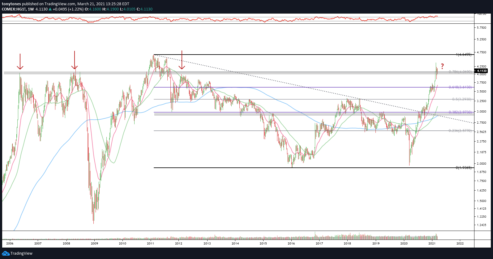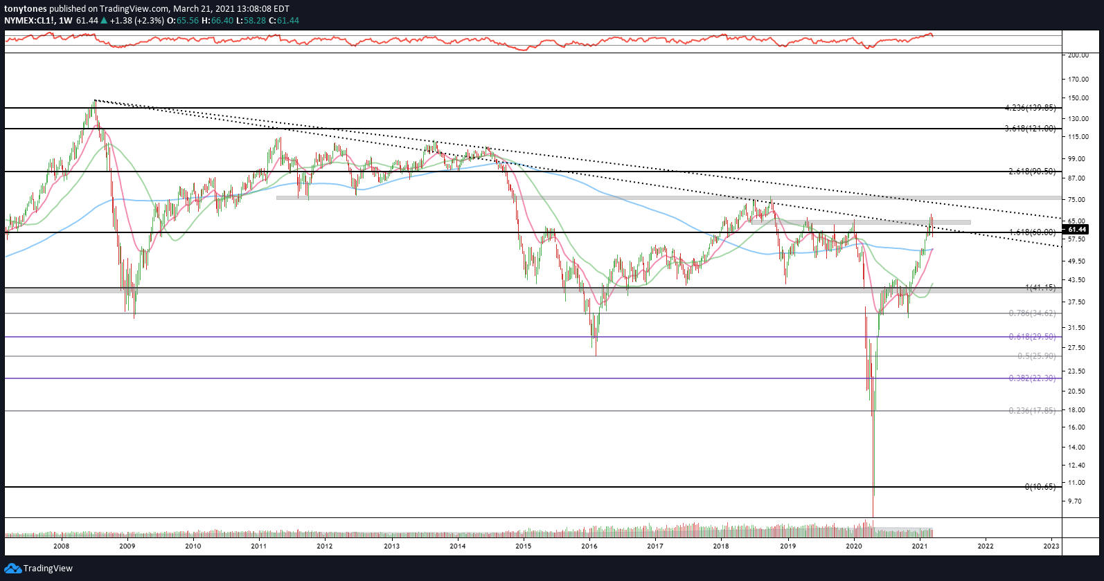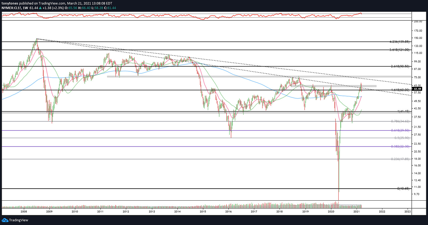 Given its large proportion of the Index, crude oil is a huge part of the picture. Unsurprisingly, crude oil futures ($CL1!) ran into some weakness this week at the pre-COVID highs around $65 per barrel. We’d like to crude retake those levels to keep the CRB Index pushing higher.