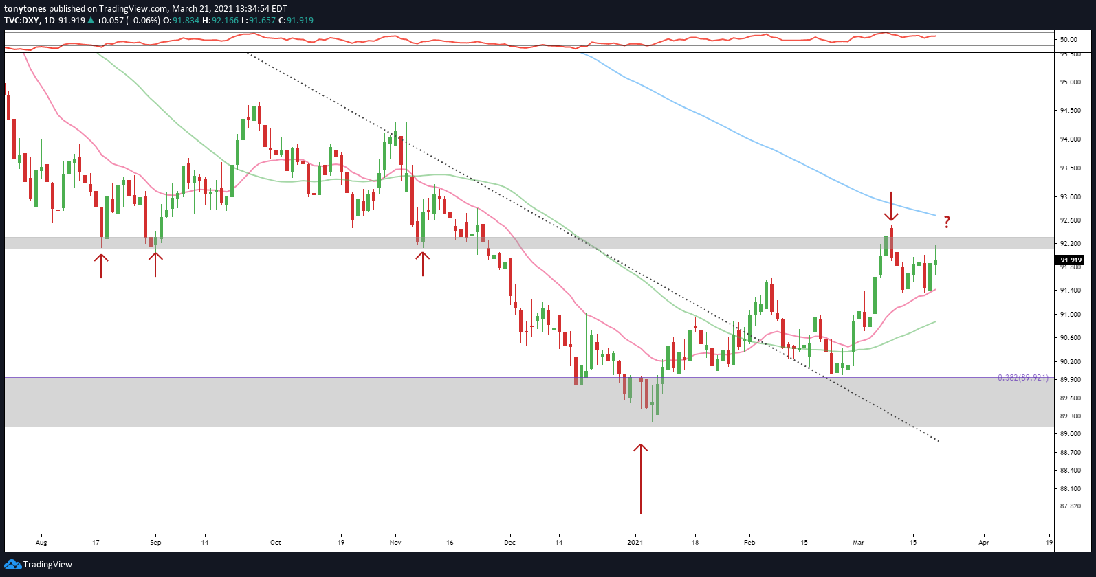 If we zoom in to the daily chart we can visualize the more recent action. Keep an eye on a sustained move above $92.3 for a confirmed reversal within this larger range.