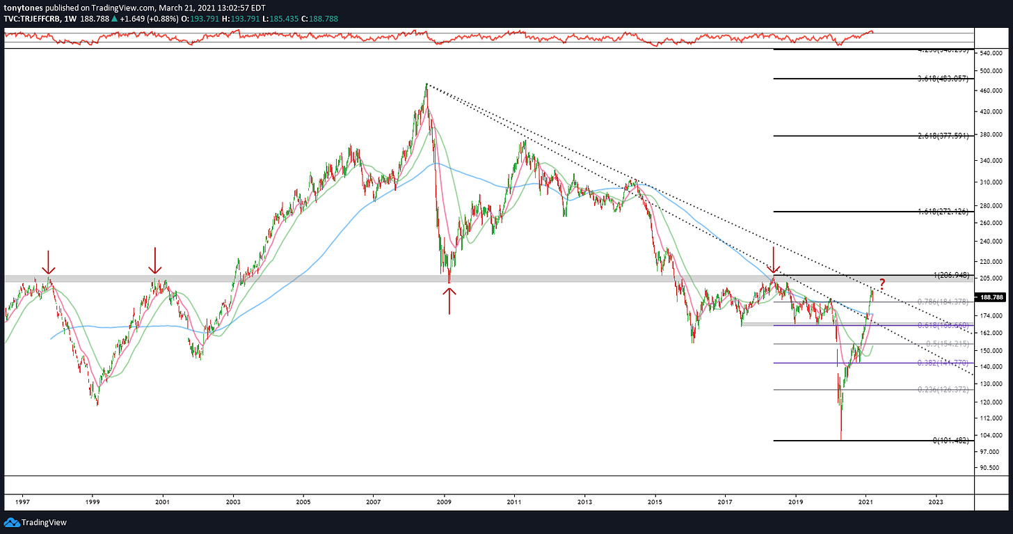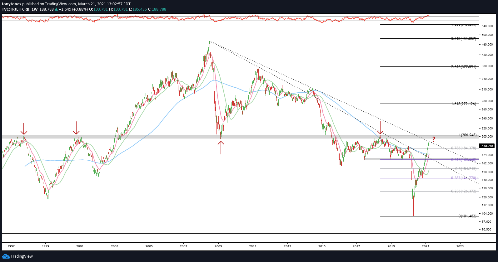 Here’s the chart of the Thomson Reuters Core Commodity CRB Index ($TRJEFFCRB). You can see its had some weakness near the trendline from the Great Financial Crisis (“GFC”). Personally, I would like to see us breakout and move onto test the $207 where the commodity rallies of 1997, 2001, and 2018 fizzled out.