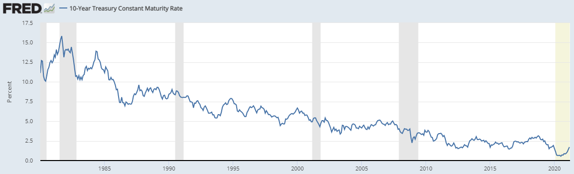 An example of a secular change is the longer-term downtrend in interest rates following the inflation scare of the 1980’s. The chart below shows that long-term trend. Notice the cyclical gyrations up and down within the longer term move down.