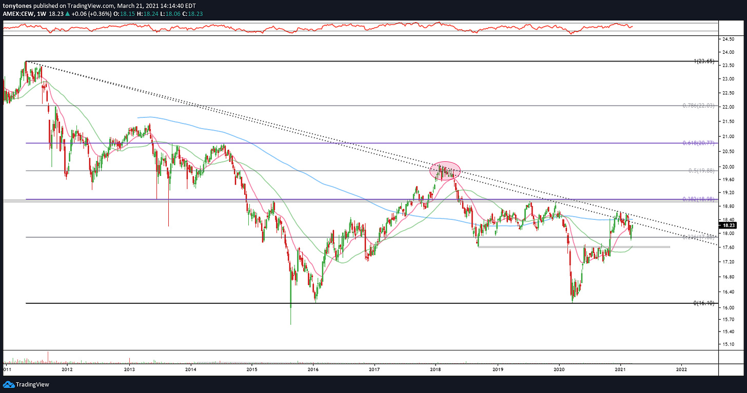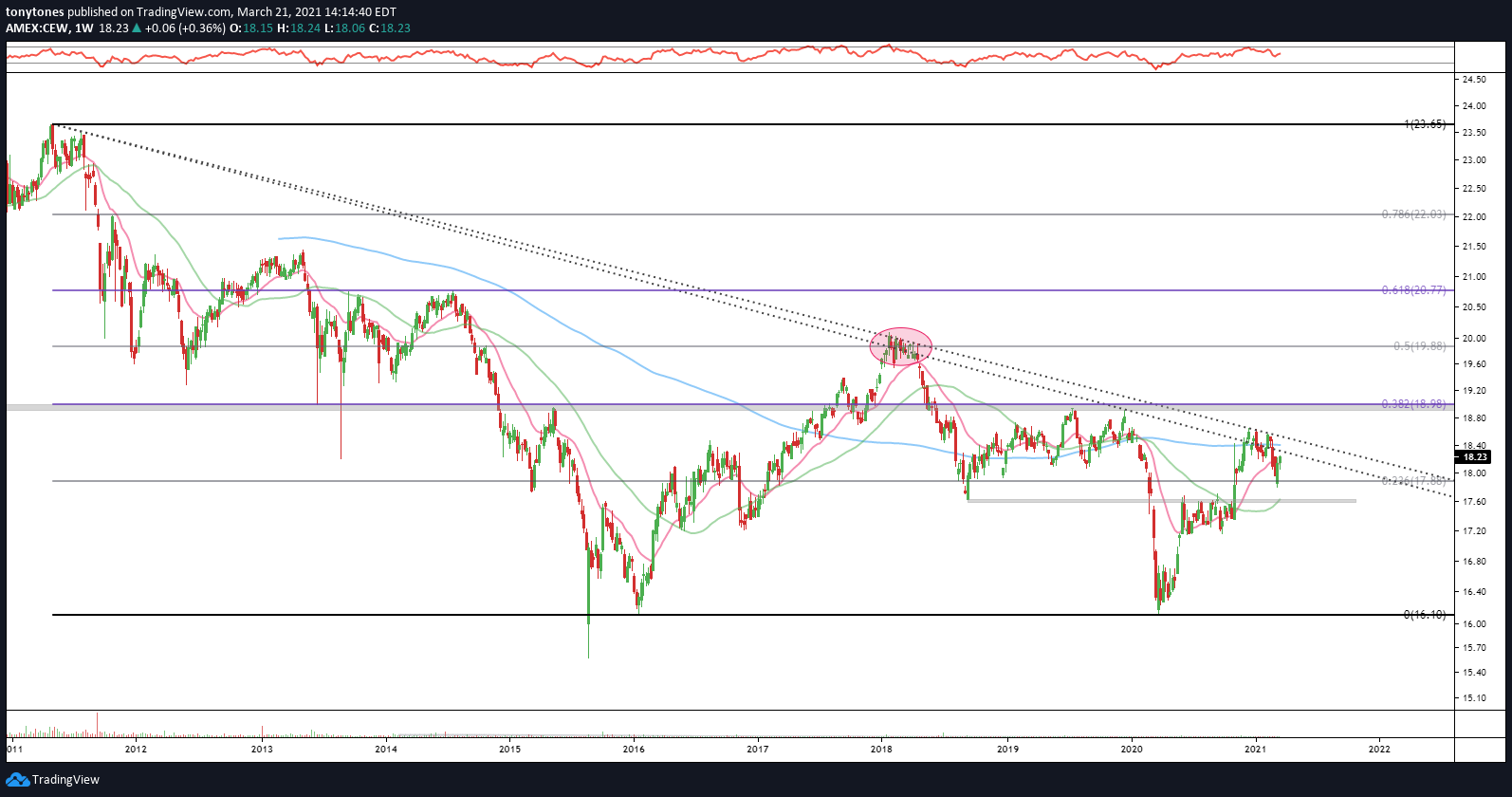 We can also use the emerging market currencies basket as a gauge on the dollar strength and weakness. Here’s the $CEW chart we have been using. Still battling the larger downtrend and below the pre-COVID highs.