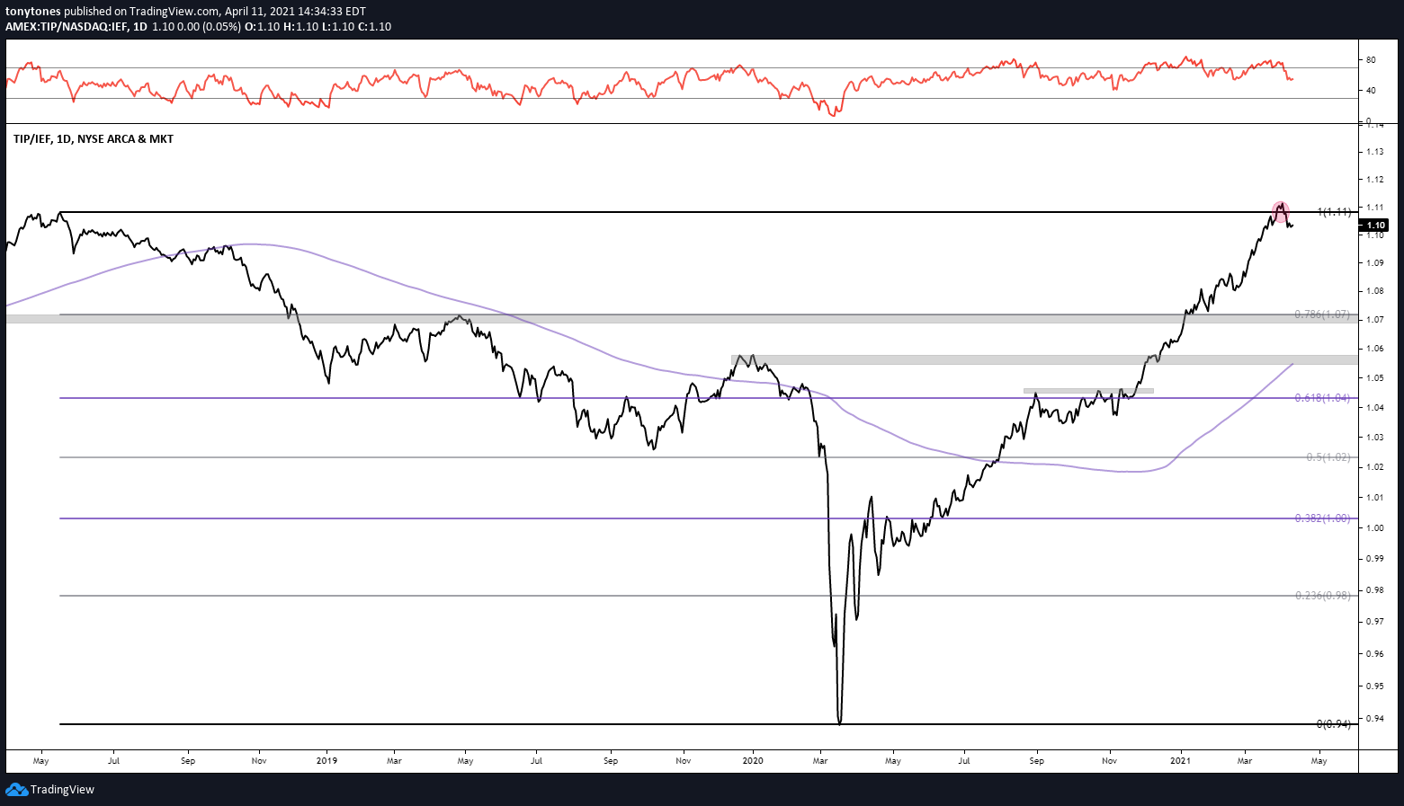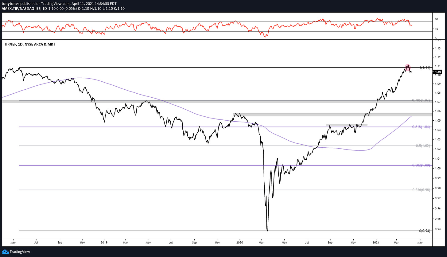 Inflation is another driver of interest rates. To gauge inflation sentiment, we can use the relative chart of the $TIP/$IEF , which compares the TIPS (“Treasury Inflation-Protected Securities) to their non-inflation-protected counterparts.