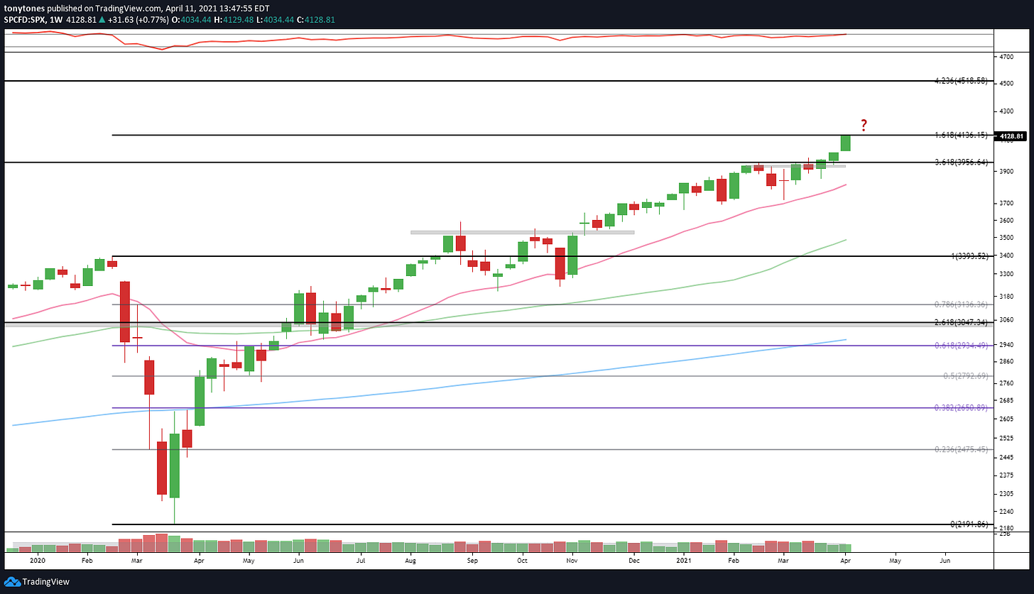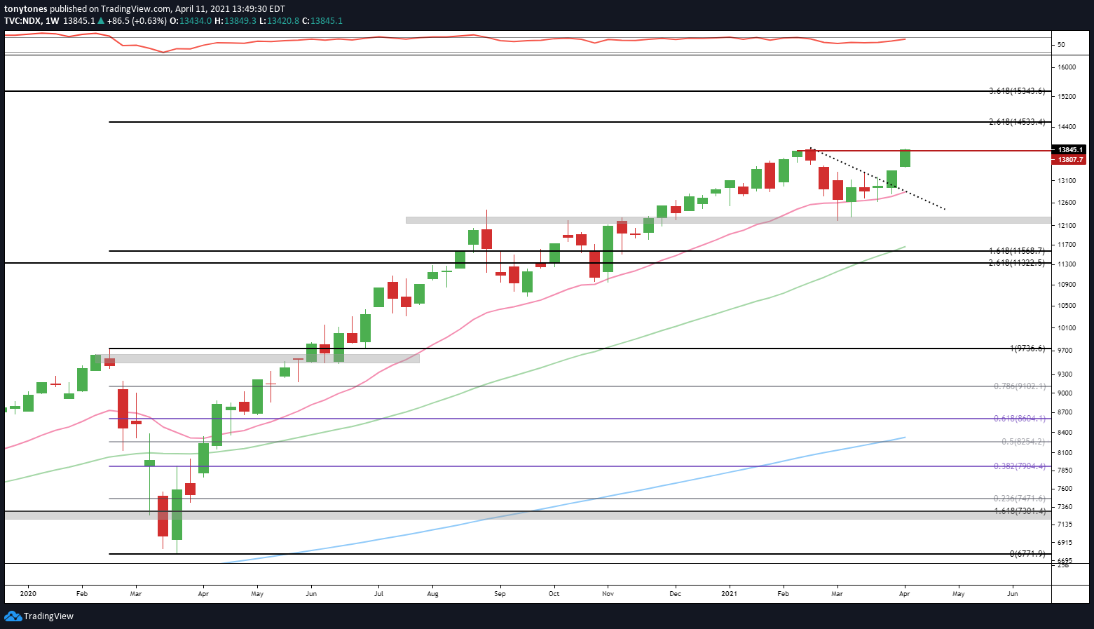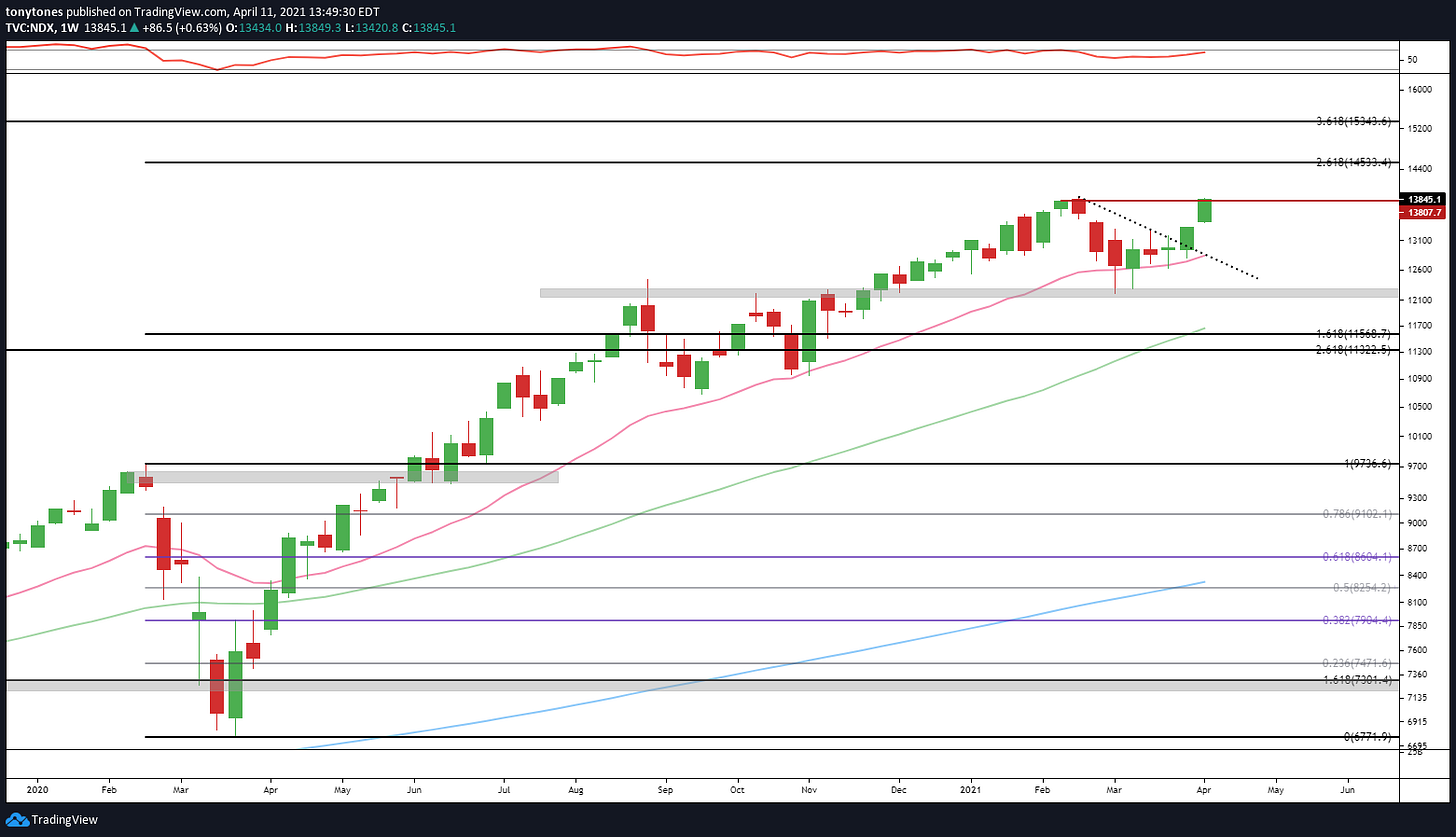 Nasdaq 100 ($NDX). Fresh all-time highs (“ATHs”) on a weekly close after a shaky February and March. If those highs can hold around $13.8K, look for the tech-heavy index to target $14,533 next, which is the 2.618 extension from the COVID drawdown.