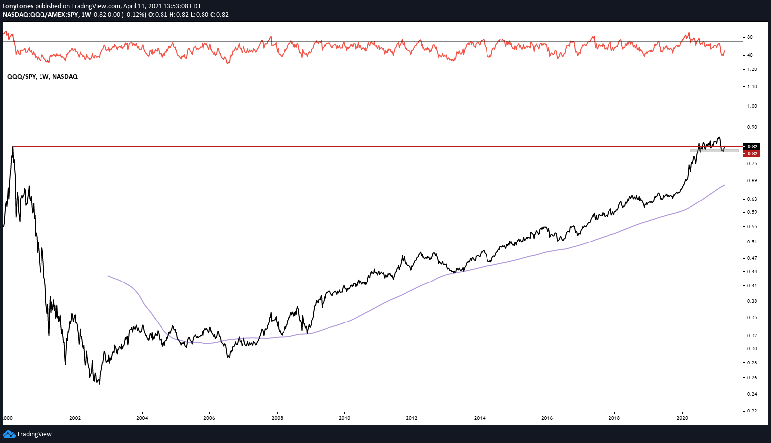 Looking at the relative relationship between the Nasdaq 100 ETF ($QQQ) versus the S&P 500 ETF ($SPY) things get a little more interesting.