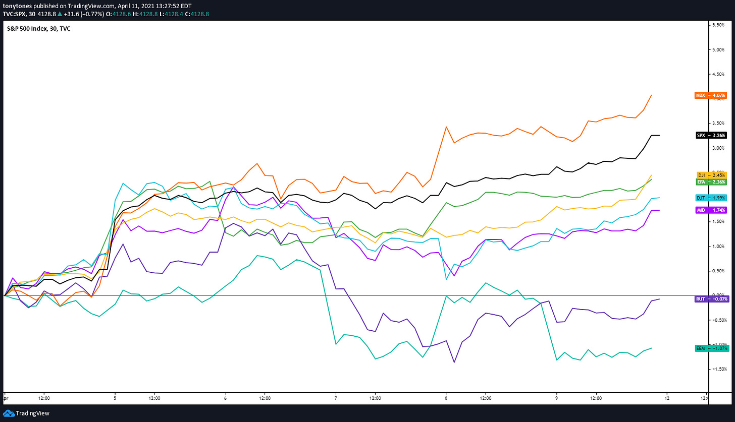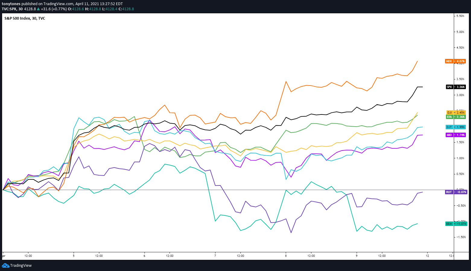 Rotation continues to be the lifeblood of the market. The Nasdaq 100 ($NDX) has gone from laggard to leader recently, returning over 4.0% in April. Other aspects of the Easter playbook have also worked out well thus far — U.S. large-cap equities ($SPX) are leading, followed by Developed International ($EFA) and then Emerging Markets ($EEM).