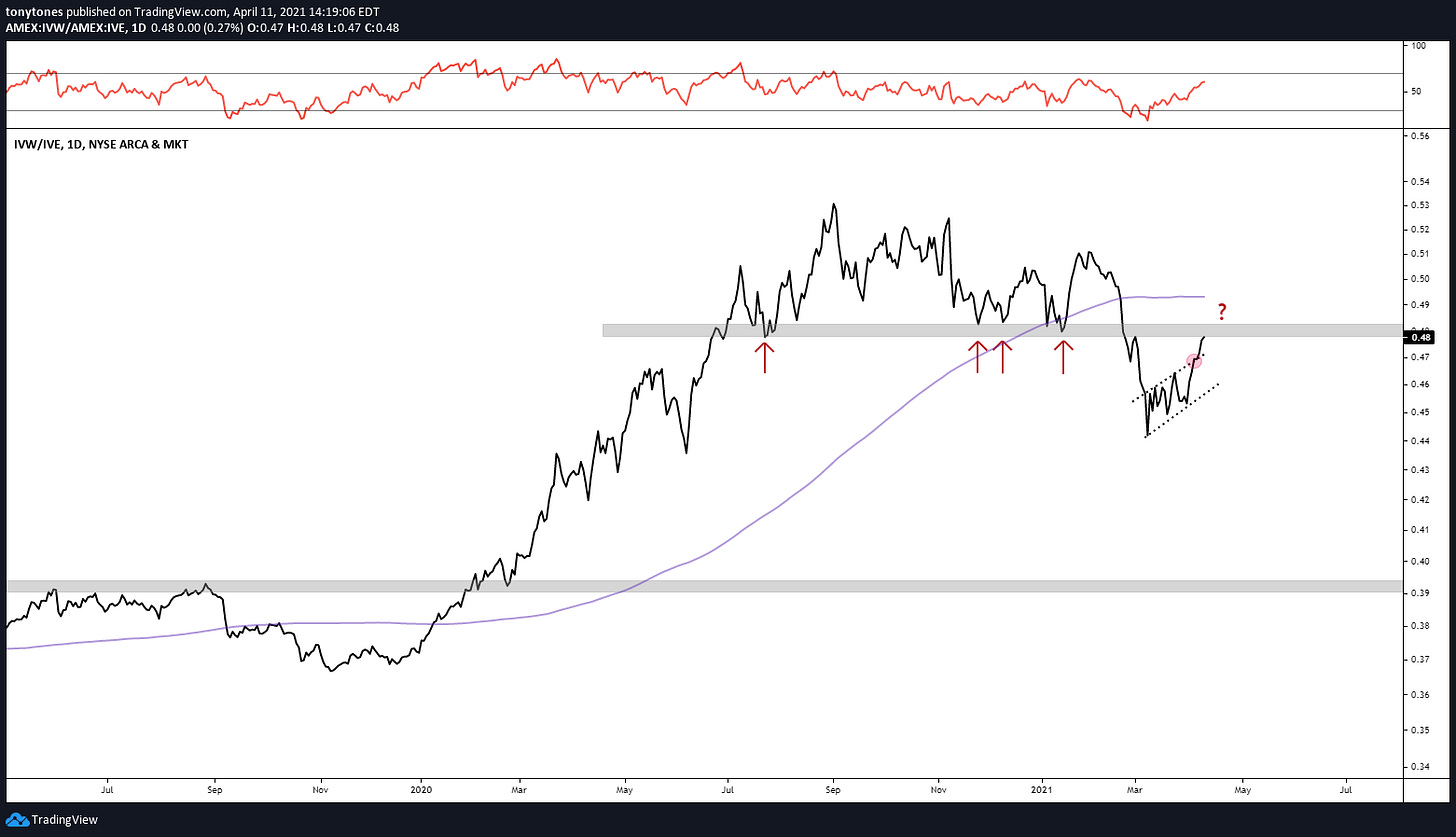 This relative chart is less constructive that the $QQQ/$SPY at the moment, as former support may act as resistance here soon. Let’s see how that plays out. This is important given the recent bias towards value stocks.