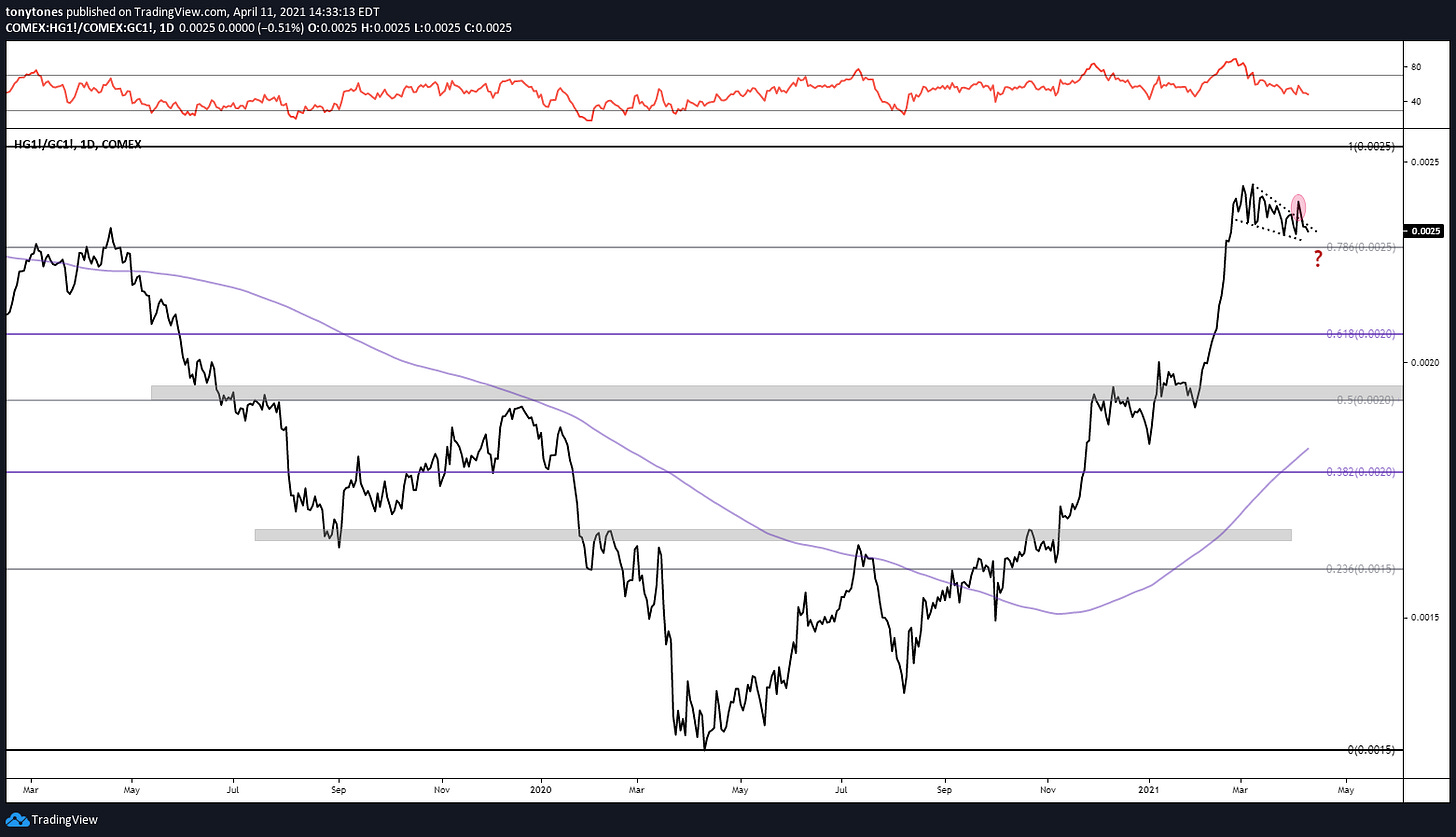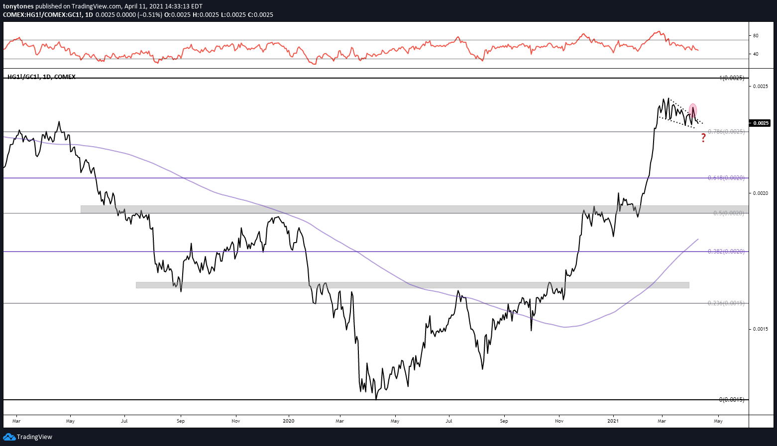 Using the relative chart of Copper Futures ($HG1!) versus Gold Futures ($GC1!) as a proxy for the US10Y, we can see a failed bull flag break upwards and some choppiness since. A lower move in this relationship implies a lower 10-year Treasury rate.