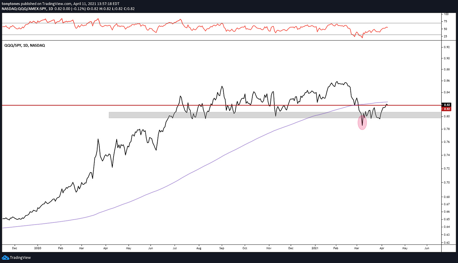 Here’s a closer look at the daily chart of $QQQ/$SPY. We can see that the Q’s had a false break lower in early March versus $SPY.
