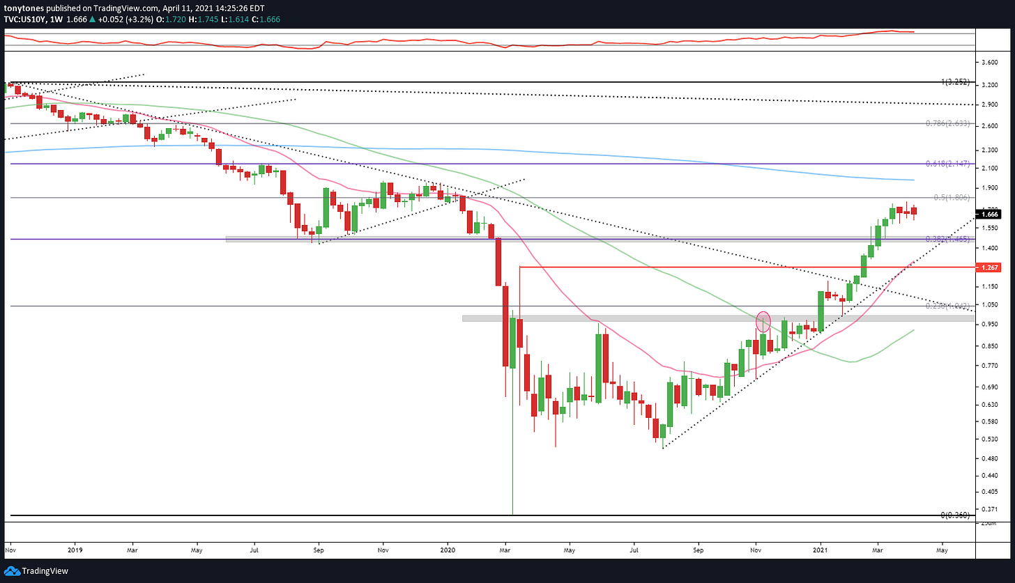 Here’s the U.S 10-Year Treasury Rate ($US10Y) consolidating in the range between our two most recent targets, 1.465% and 1.806%. Growth-biased equities are acutely sensitive (negatively) to higher rates.